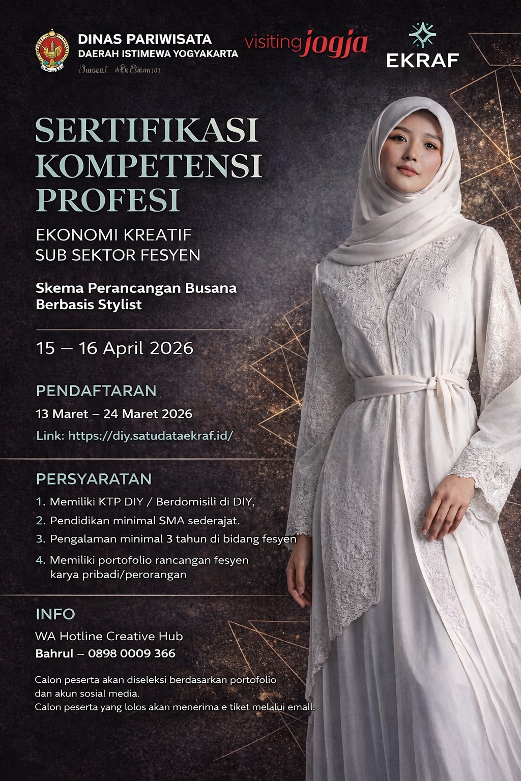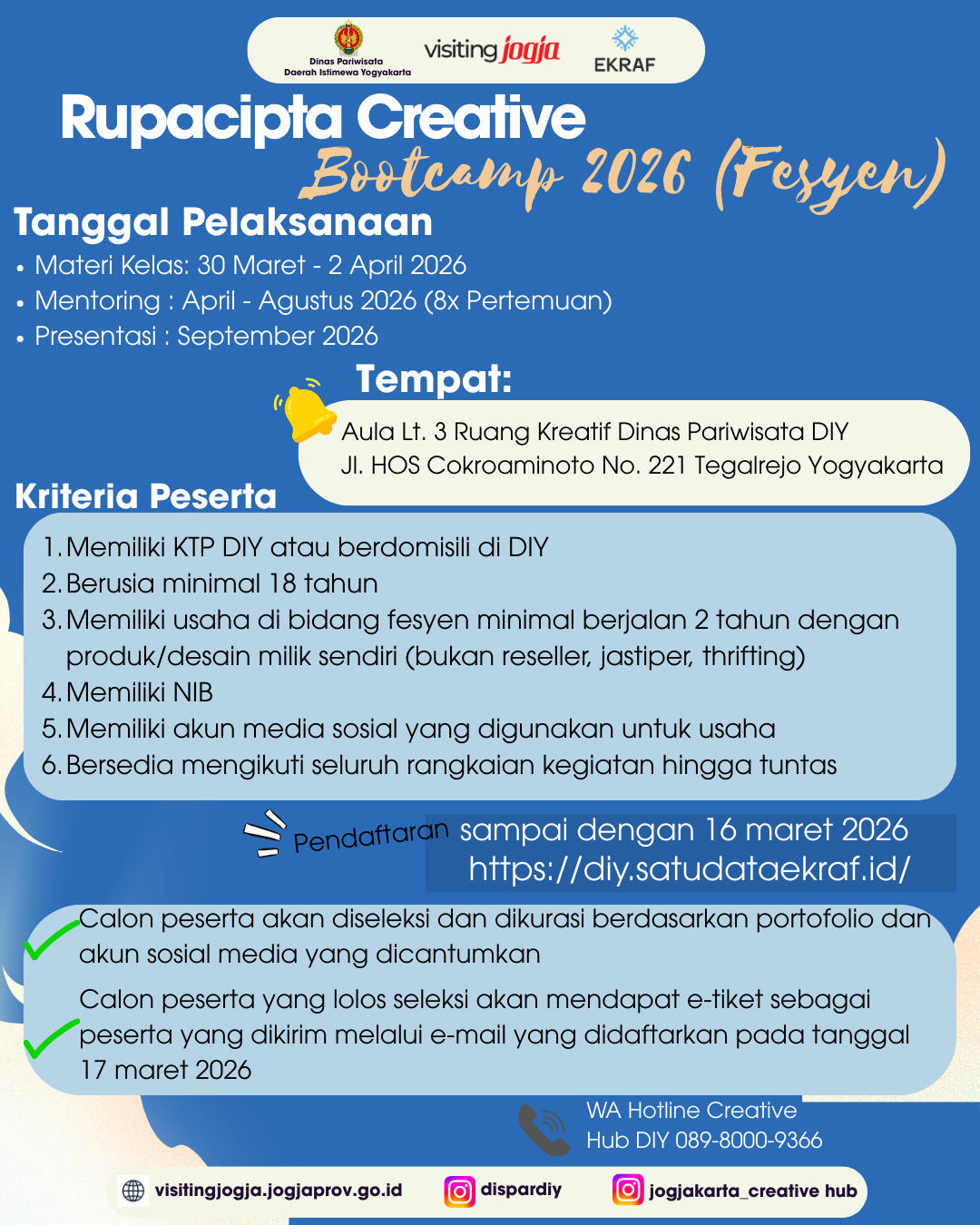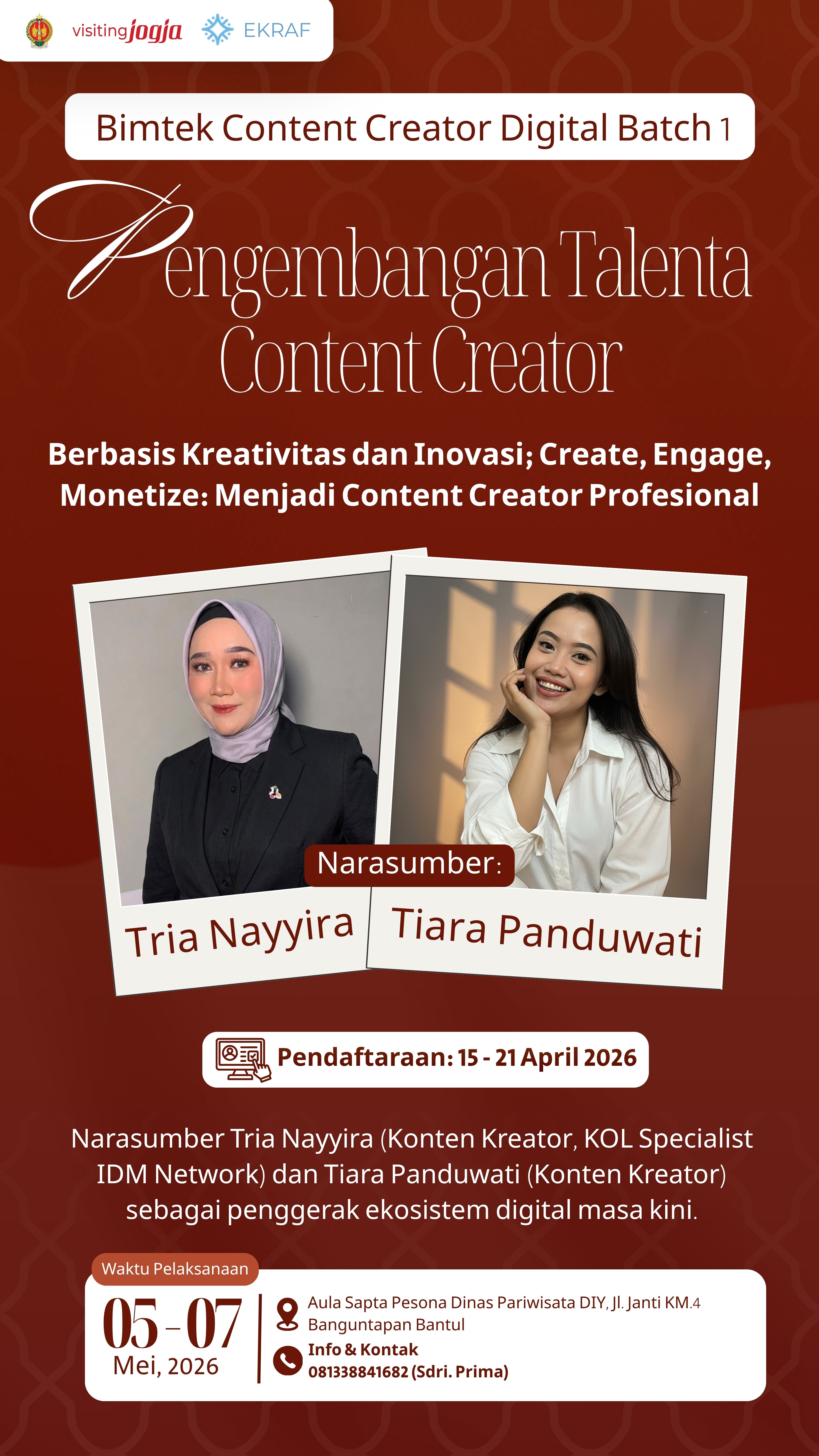 🚀 *BIMTEK CONTENT CREATOR DIGITAL – BATCH 1* Pengembangan Talenta Content Creator Digital Berbasis Kreativitas dan Inovasi Create, Engage, Monetize: Menjadi Content Creator Profesional ✨ Waktunya naik level jadi kreator profesional! Di era digital yang serba cepat, kreativitas saja tidak cukup. Dibutuhkan strategi, konsistensi, dan kemampuan monetisasi agar kontenmu benar-benar berdampak. Melalui program ini, kamu akan dibekali keterampilan praktis untuk berkembang sebagai *Content Creator Digital berbasis kreativitas dan inovasi*. 👩🏫 *Narasumber & Instruktur:* * Tria Nayyira– KOL Specialist IDM Network * Tiara D. Panduwati – Content Creator Professional 🔥 *Apa yang akan kamu dapatkan?* * Teknik membuat konten yang menarik & relevan * Strategi membangun engagement audiens * Cara mengembangkan personal branding * Insight monetisasi konten di platform digital * 📌 *Persyaratan Peserta:* * KTP DIY atau berdomisili di DIY * Memiliki HP/device yang mendukung (TikTok, IG & aplikasi editing) * Mampu menggunakan aplikasi edit video (CapCut, VN, dll) * Memiliki akun media sosial aktif (IG/TikTok, dll) * Bersedia mengikuti pelatihan selama 3 hari penuh ⚠️ *Ketentuan Penting:* * Akun media sosial **tidak diprivate* untuk proses kurasi) * Peserta akan *diseleksi berdasarkan portofolio & akun sosial media* * Peserta lolos akan menerima *e-tiket via email terdaftar (Akun SDE)* Ayo daftar sekarang... Gratis Melalui: diy.satudataekraf.id Kuota Terbatas 📲 *Informasi & Kontak:* WA Narahubung (Sdri. Prima) 📞 0813 3884 1682 -🎬 *Saatnya ubah ide jadi karya, karya jadi peluang!* Jangan lewatkan kesempatan untuk berkembang menjadi *Content Creator Profesional* 🚀