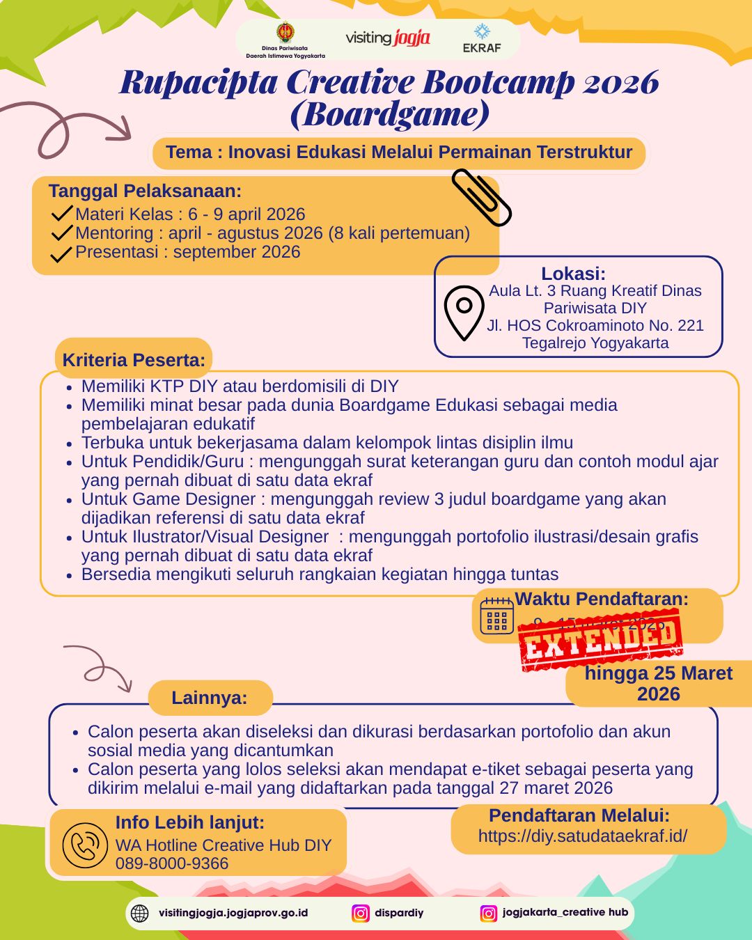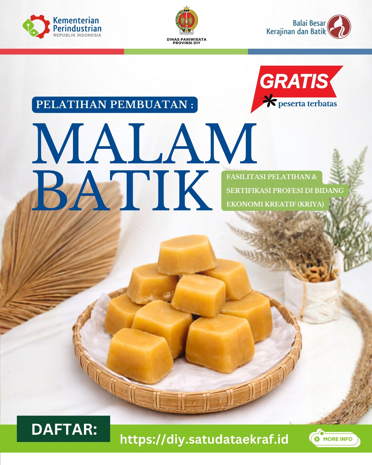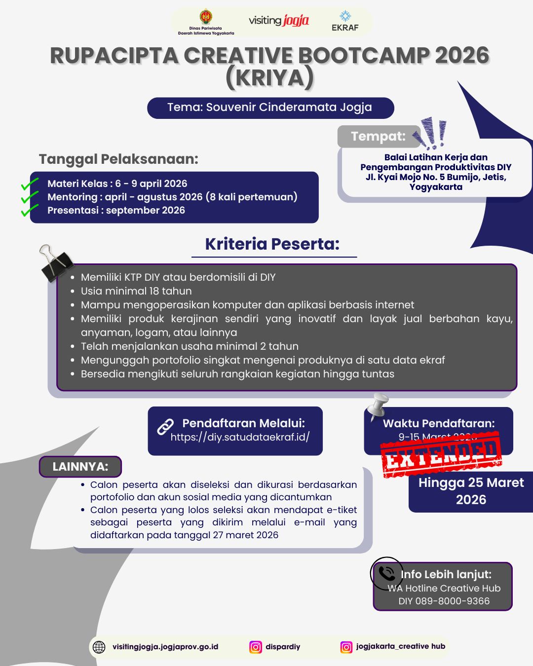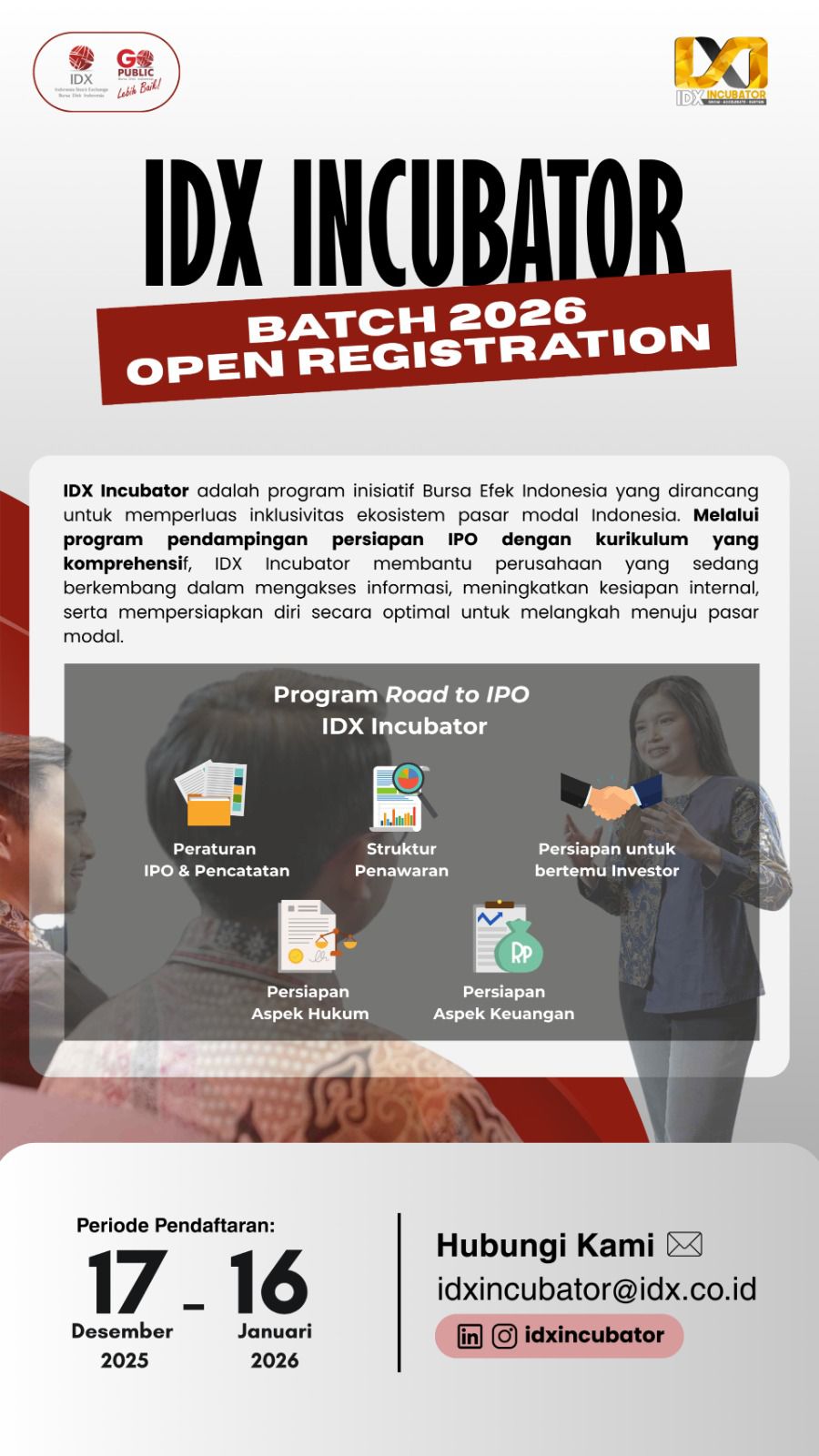 BEI menyelenggarakan program IDX Incubator Batch 2026, program ini sebagai bentuk dukungan BEI untuk membantu menyiapkan pelaku Ekonomi Kreatif dan start-up menuju proses IPO. Bagi badan usaha binaan bidang Pengembangan Ekonomi Kreatif Dinas Pariwisata DIY. Persyaratannya adalah Badan Usaha Ekonomi Kreatif dengan pendanaan sekitar minimal Rp10.000.000.000,-. Adapun tata cara pendaftaran dan informasi lengkap dapat kunjungi : incubator.idx.co.id