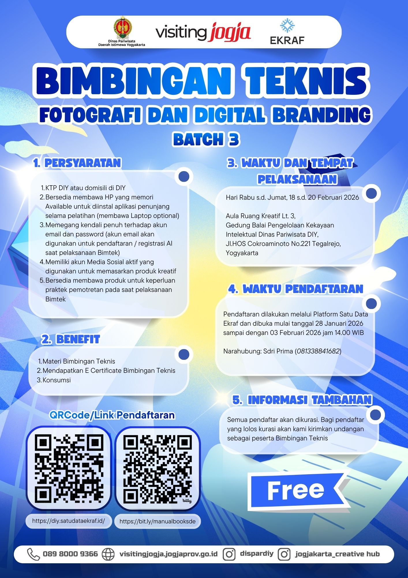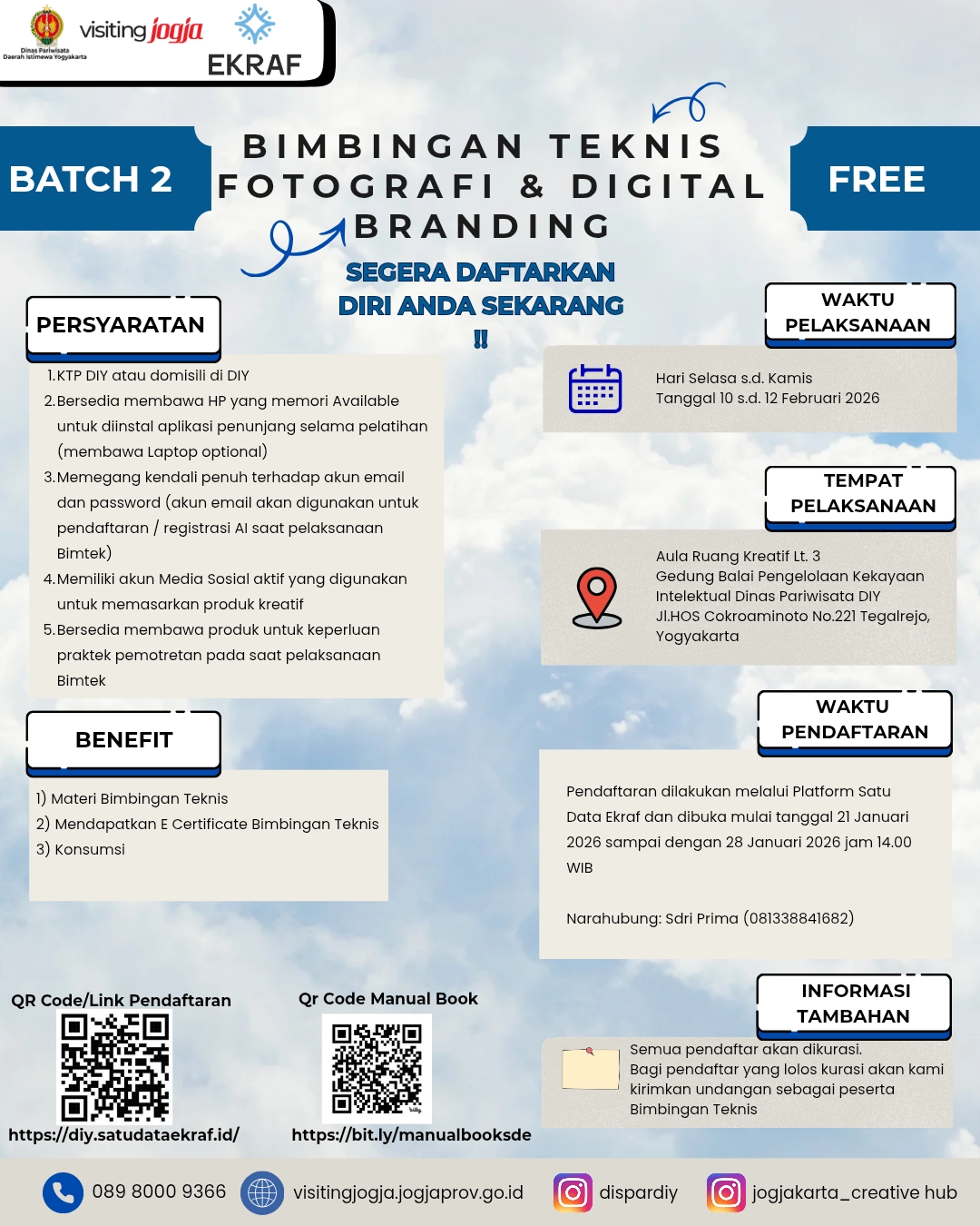 BIMBINGAN TEKNIS FOTOGRAFI DAN DIGITAL BRANDING BATCH 2: PEMANFAATAN AI DAN MEDIA SOSIAL UNTUK PENGUATAN DAYA SAING PELAKU EKONOMI KREATIF YANG AKAN DILAKSANAKAN PADA HARI SELASA S.D. KAMIS, 10 S.D. 12 FEBRUARI 2026