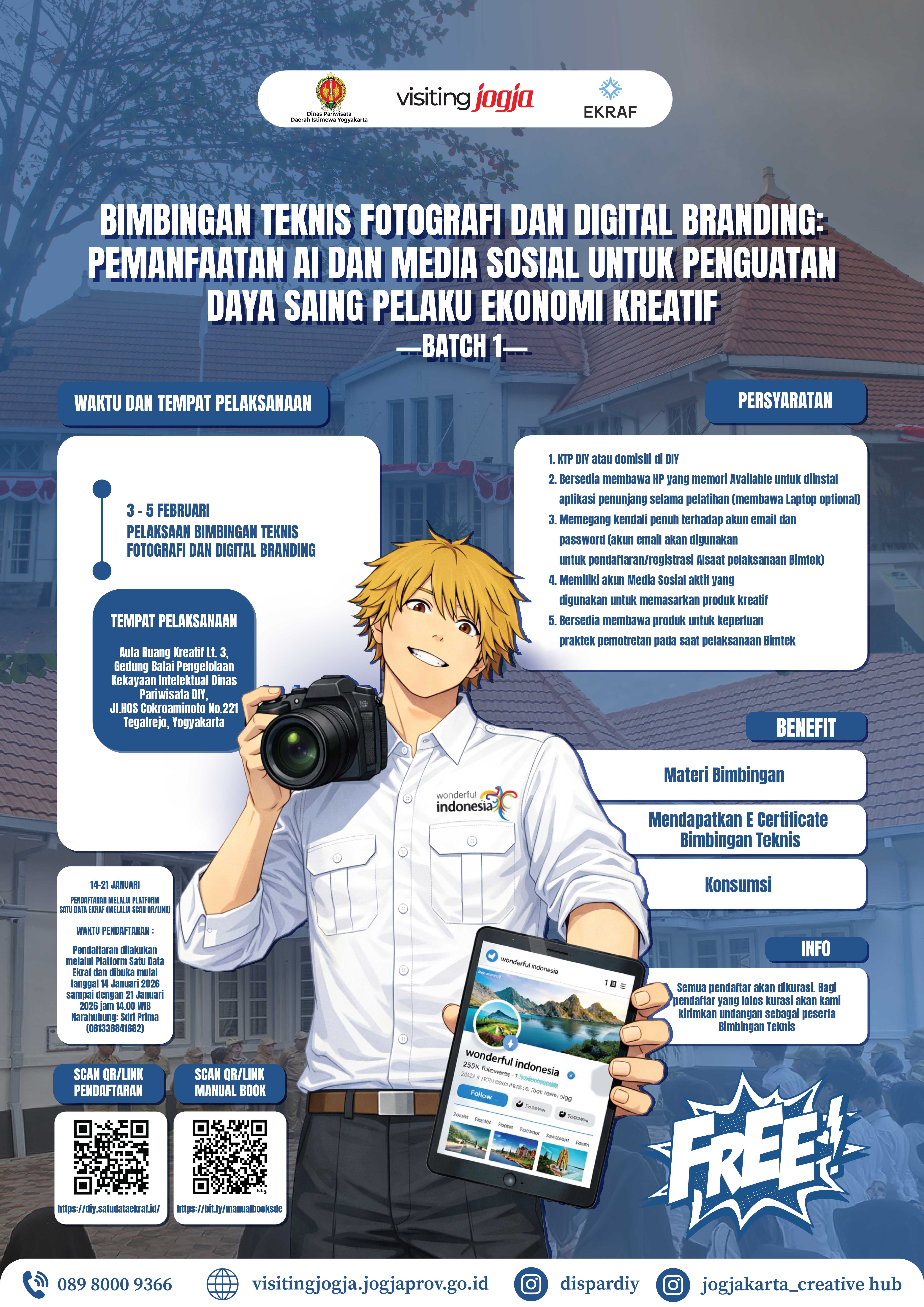 BIMBINGAN TEKNIS FOTOGRAFI DAN DIGITAL BRANDING BATCH 1: PEMANFAATAN AI DAN MEDIA SOSIAL UNTUK PENGUATAN DAYA SAING PELAKU EKONOMI KREATIF YANG AKAN DILAKSANAKAN PADA HARI SELASA s/d KAMIIS TANGGAL 03 s/d 05 FEBRUARI 2026